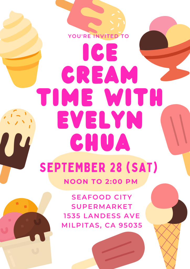 Join Evelyn Chua on September 28, 2024 at Seafood City Supermarket for an afternoon of Ice Cream and Chat. See flyer below.